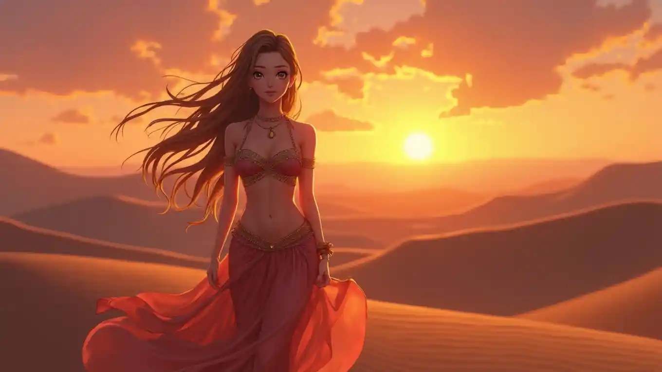 Gadis anime ultra HD dengan gambar skala besar horizontal, berseri-seri menakjubkan dan petualangan, bersinar di senja, berdiri di atas bukit pasir gurun luar ruangan yang penuh warna dengan matahari terbenam, mengenakan pakaian wanita menari perut yang mengalir dengan garis leher yang dalam dan kerudung transparan, rambut panjang menari di atas angin dengan senyum hangat, mata besar berkilau kulit, palet emas dan oranye yang hangat, fitur wajah yang canggih, riasan sempurna, penuh dengan suasana eksotis dan petualangan, cahaya lembut dan pencahayaan alami, Menonjolkan dadanya yang anggun dan dipahat dengan belahan dada yang halus, serta kakinya yang panjang dan kencang dalam sikap yang indah, memancarkan keindahan dan misteri.