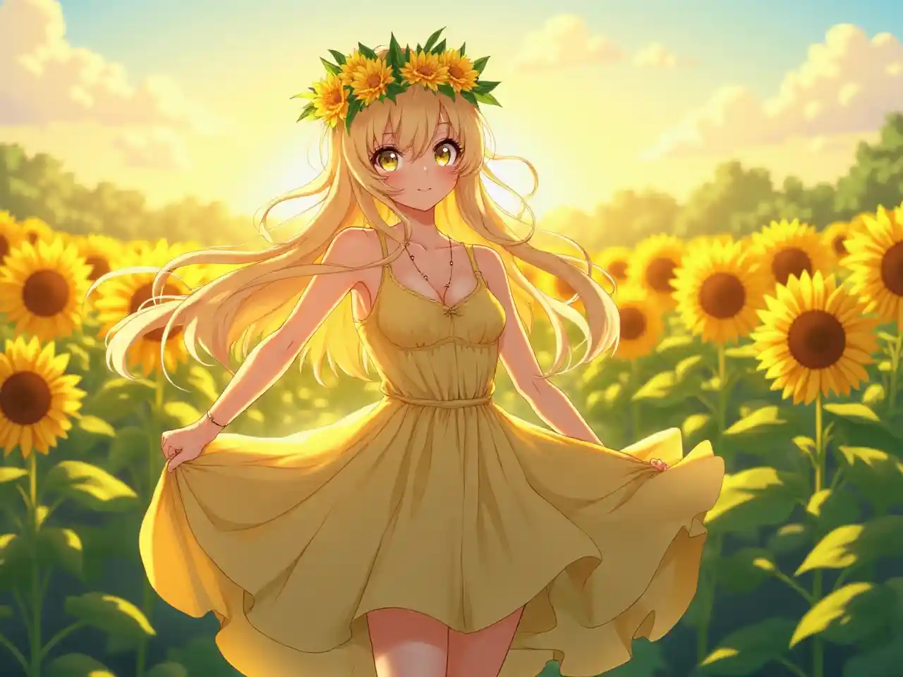 Gadis anime ultra HD dengan gambar skala besar lateral, mempesona dan glamor, mandi di jam emas, berdiri di ladang bunga matahari di bawah langit cerah di luar ruangan, mengenakan pakaian musim panas, leher jatuh, mahkota bunga di kepala, rambut panjang menangkap cahaya, senyum berseri-seri, mata besar berkilau, kulit berkilau, cerah palet kuning-hijau, fitur wajah lembut, riasan sempurna, suasana ceria dan hidup, cahaya lembut dan pencahayaan alami, menyoroti daya tariknya, Dengan belahan dada yang halus di dada yang dipahat, kaki panjang yang kencang berpose santai, memancarkan kecantikan dan kegembiraan.