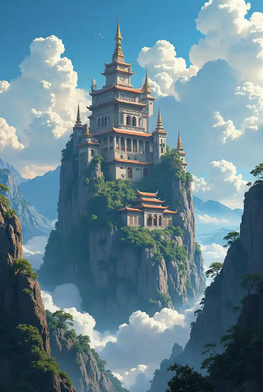 Istana megah di puncak gunung, pengadilan surga, mencerminkan estetika anime mitos.