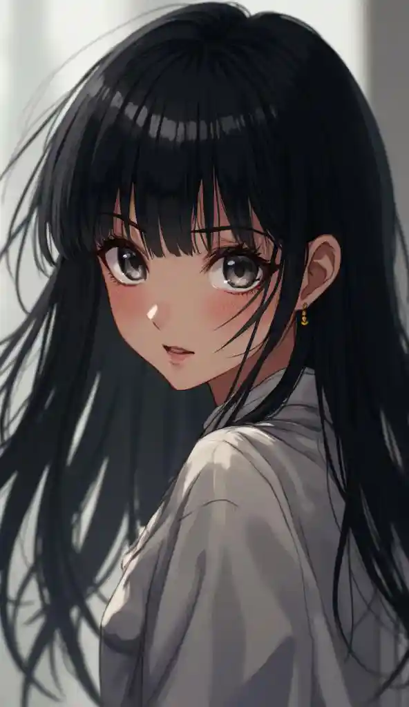 Kedalaman bidang, Ilustrasi penggambaran sudut dinamis, Postur dinamis, Kualitas terbaik, Mata detail, Mata sempurna, Mata realistis, Rambut hitam, Rambut panjang, Poni, (ba