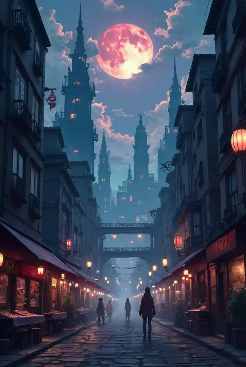 Underworld metropolis, demon markets and angelic sanctuaries, channeling a supernatural anime realm.