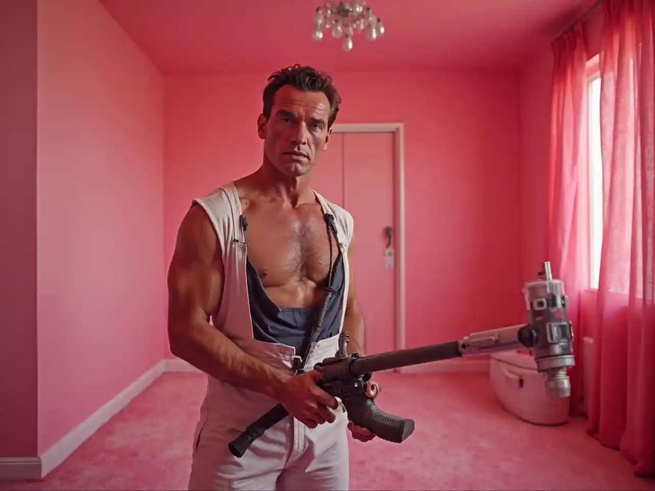 Arnold Schwarzenegger memegang Hoover sebagai senjata di kamar merah muda
