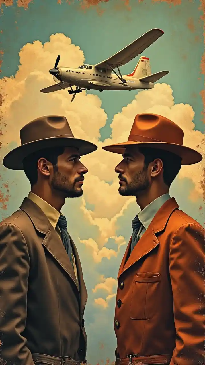 Satu poster, dua pria bertopi, berhadapan, pesawat terbang di atas mereka, Altichiero, cubo-futuristik, poster, poster art