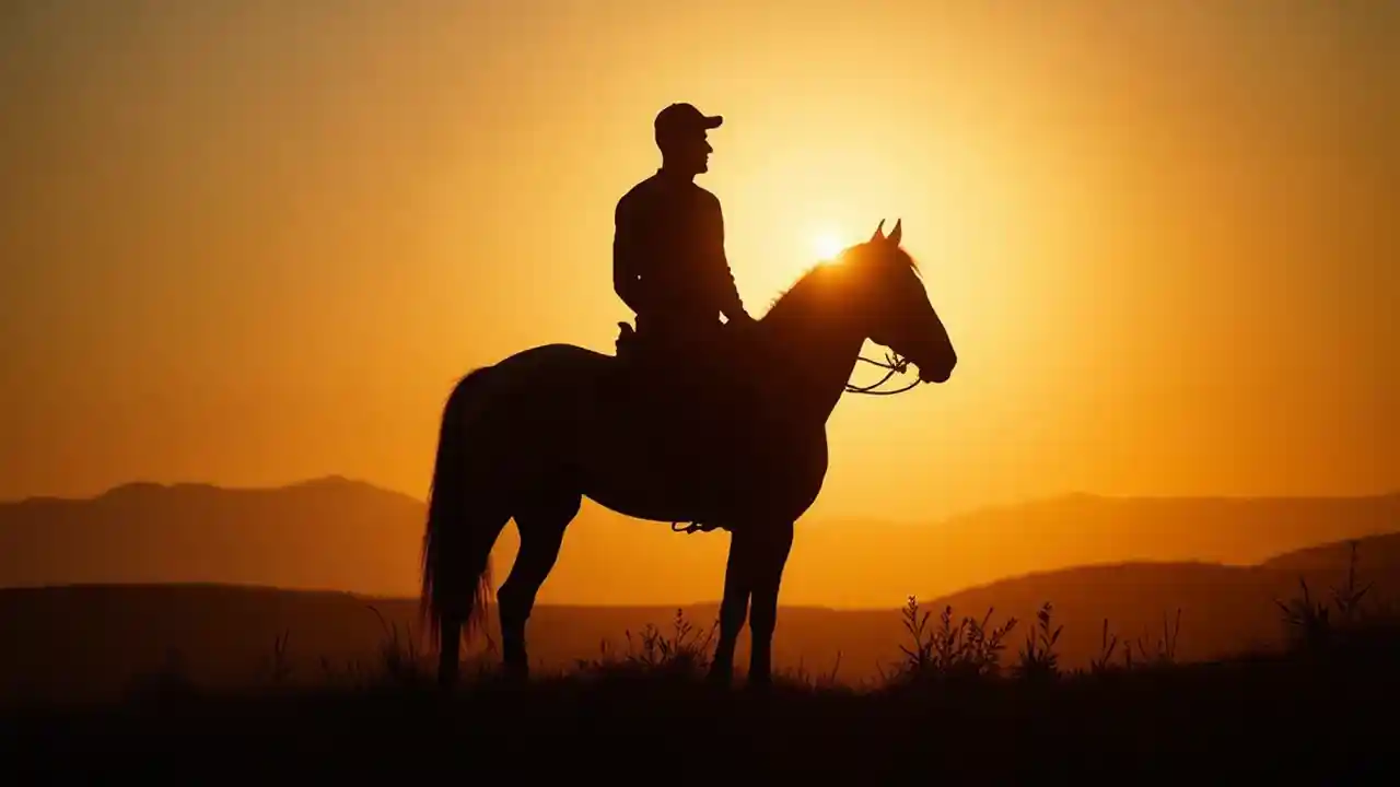 AsherFoto seorang pria menunggang kuda dengan lampu latar. Siluet, dramatisasi, artistik, gaya bayangan