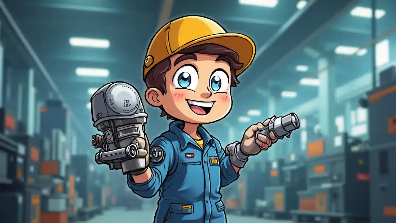 Operator mesin karakter kartun memegang klip selang mobil dengan tulisan tridon ideal di pabrik manufaktur