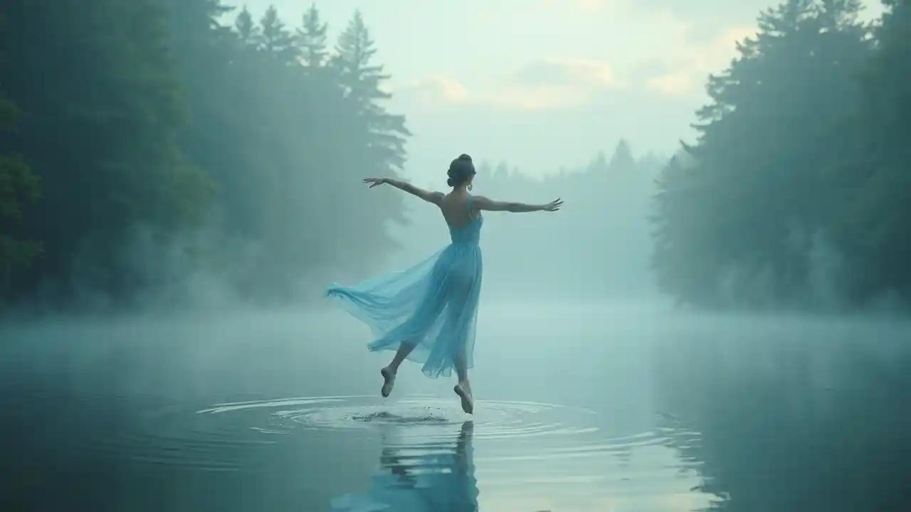 Seorang wanita cantik dengan tubuh yang indah, mengenakan gaun balet transparan berwarna biru muda, menari (jump-fly-turn) gaya balet di atas danau impian. Cahaya halus dan romantis mengalir melalui hutan berkabut di tepi danau, menciptakan suasana seperti film, sangat detail, ultra-detail, resolusi UHD 8K, close-up