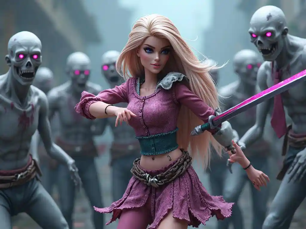 Barbie bertarung melawan zombie abu-abu dengan pedang fuchsia