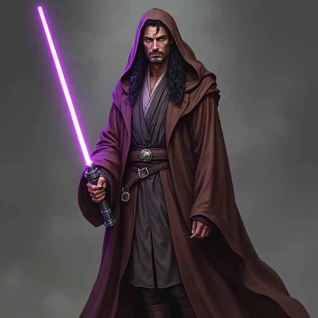 Sekujur tubuhnya, pria paruh baya itu mengenakan jubah berkerudung cokelat seperti abad ke-3 dengan pedang cahaya ungu, rambut panjang hitam legam, siap tempur