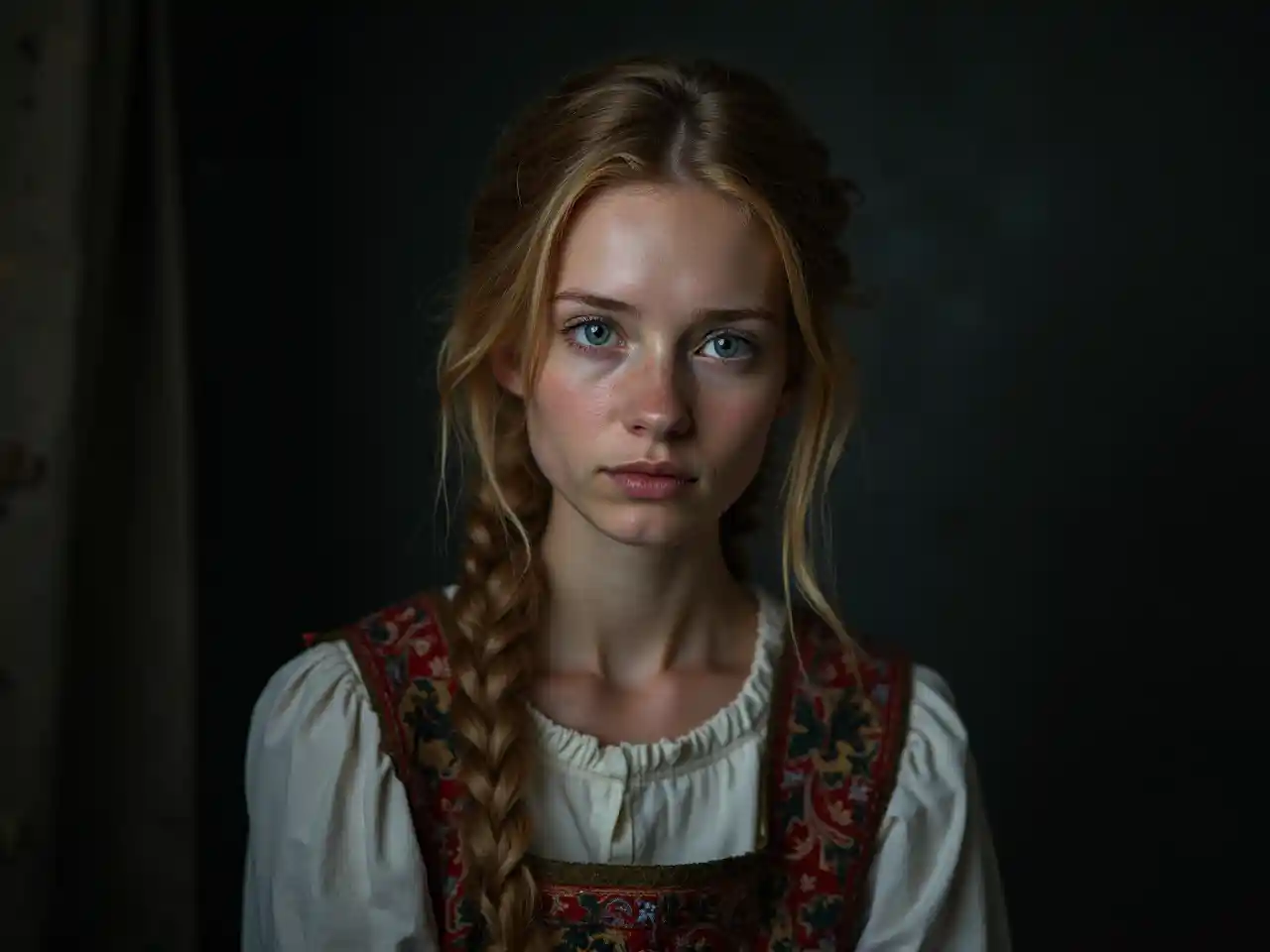 Foto depan, 25 tahun cantik, Rambut pirang, Manis, Wanita petani muda Rusia, Pakaian nasional, Adegan gelap, Suasana suram, Lensa epik, Tajam dalam detail
