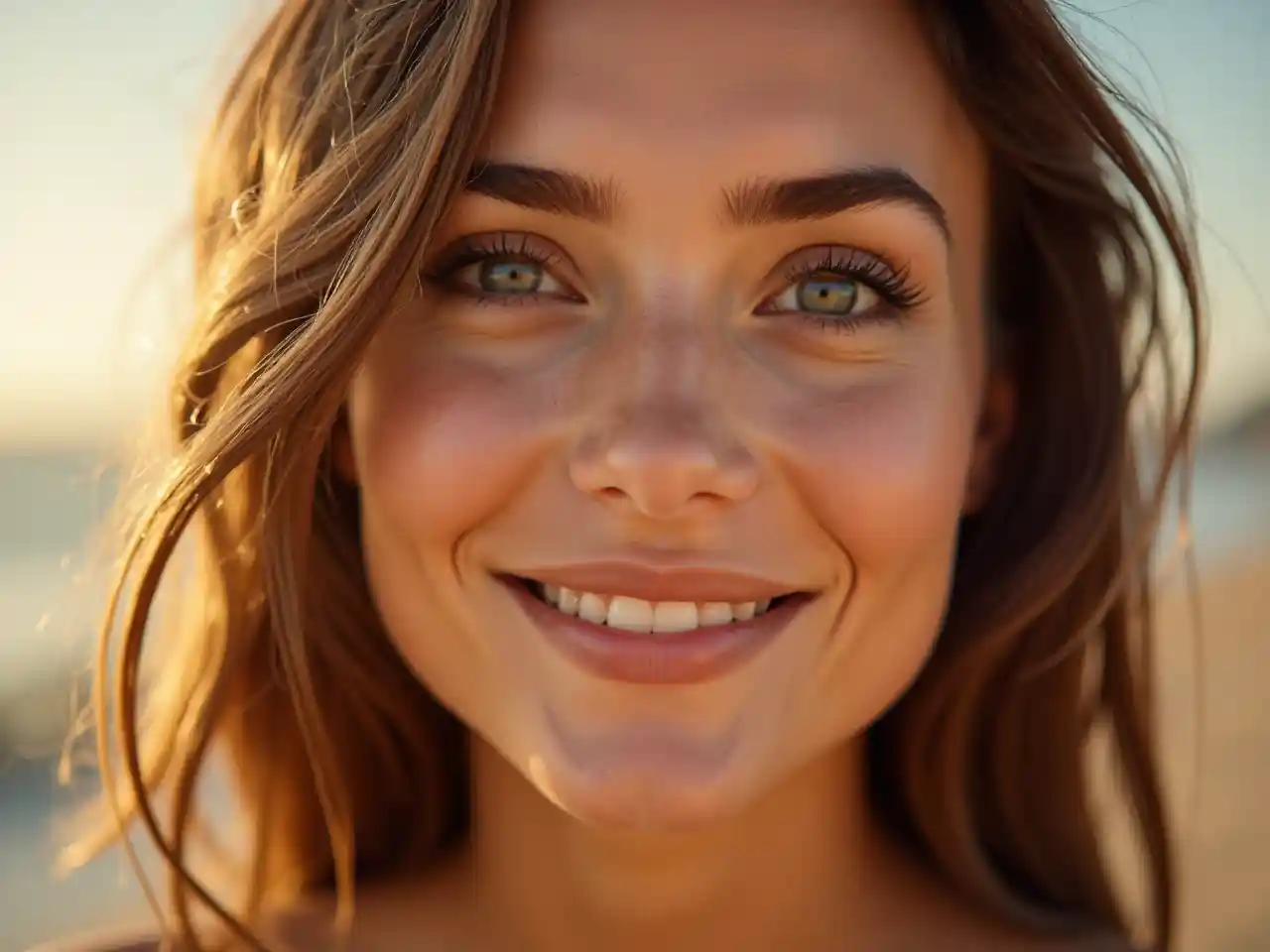 Close-up Beauty Wajah Halus Makeup Natural Senyum Cantik Tampilkan Lesung Pipit Sinar Matahari Bersinar di Wajah