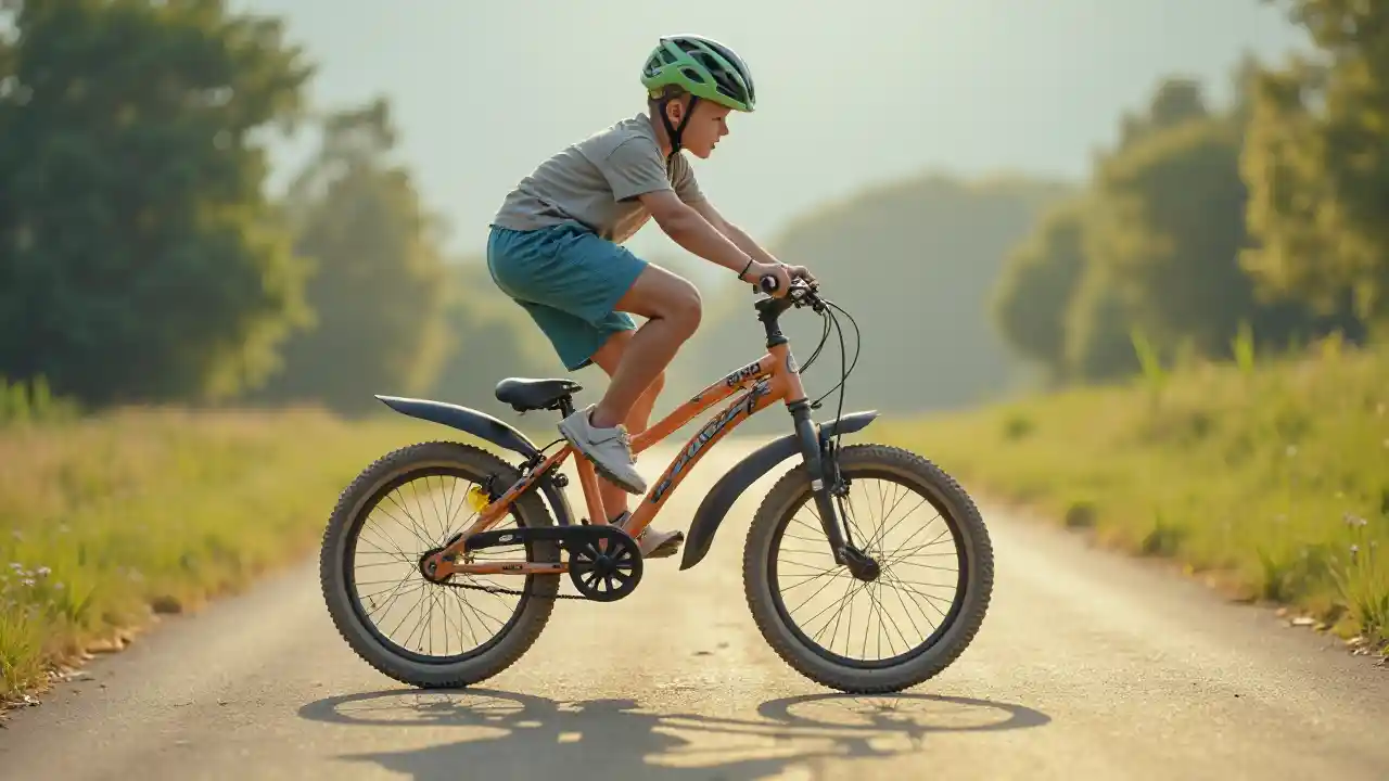 Anak laki-laki naik sepeda dengan celana pendek