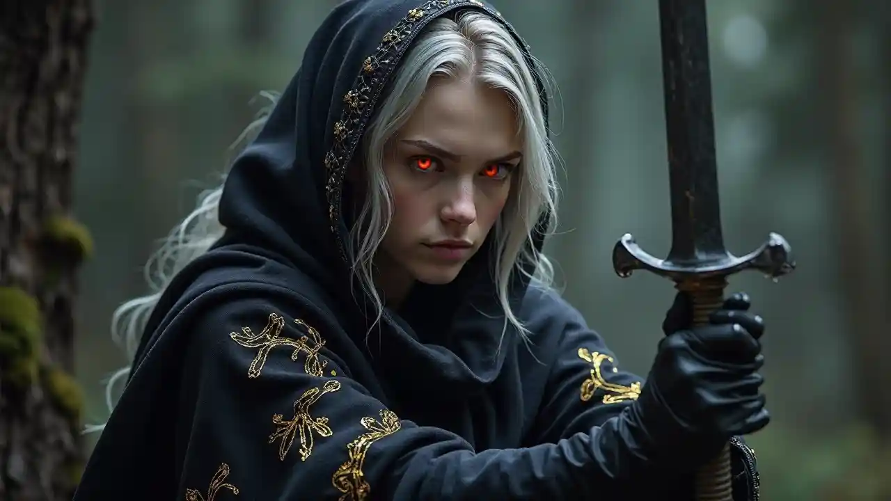 Pedang Hitam Mengayunkan Elf Dark Elf Mata Merah Rambut Perak Spider Silk Poncho Emas Inlay