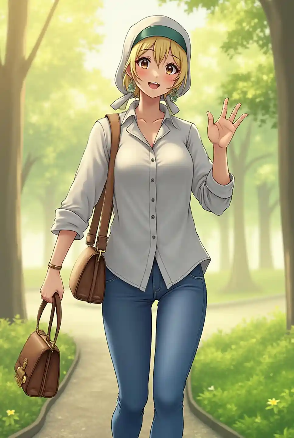RoyBagus pirang, topi, anting-anting, make up, kemeja, jeans, berjalan di taman, gadis tersenyum melambaikan dompetnya, warna yang indah, warna yang kaya, jelas, exa