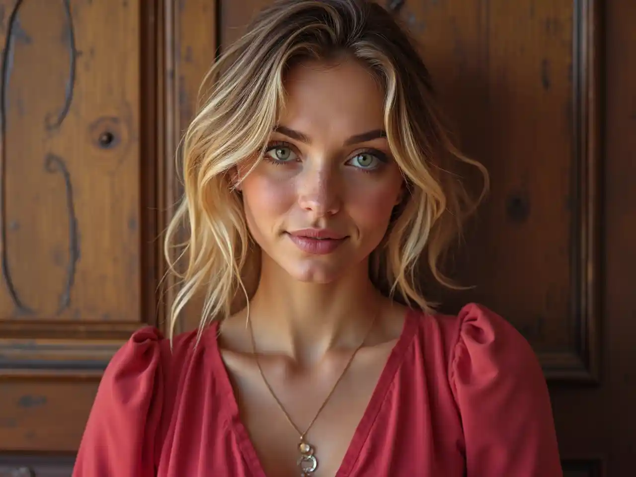 Русые волосы и голубые глаза с большим губами с большой грудью одета в красное платье