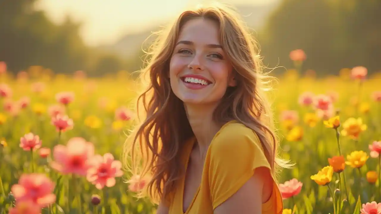Cree uma obra de arte digital de uma mulher loira,cabelos longos,de 20 anos sorrindo em um dia ensolarado de ver ã o,sentada em um campo de flores silvestres。Elaest á vestindo uma roupa colorida e tem uma express ã o alegre no rosto。A obra de arte é reproduzida com detalhes requintados,com as cores vibrantes das flores e a ilumina çã o quente criando uma atmosfera alegre e convidativa。