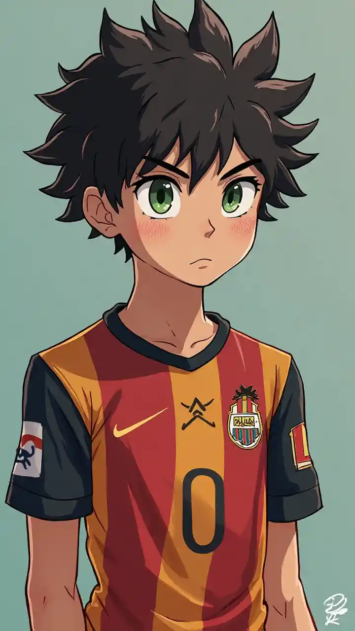 Ciptakan karakter kunci biru asli dengan gaya penulisnya dengan mata yang penuh ego → coklat, keriting, di Barcelona, memakai nomor 10, mata hijau, tangan kiri → ciptakan karakter kunci biru asli dengan gaya penulisnya dengan mata hitam, rambut hitam dengan sorotan putih kecil, campur kemeja Munich dengan lengan hitam, memakai nomor 02, tangan kanan → rambut pendek, remaja keriting, mengesankan, tanpa ekspresi