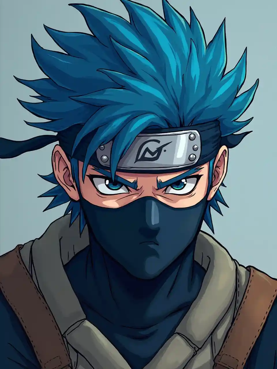 Ninja berambut biru berduri, memakai topeng dan menutup mulutnya, ekspresinya serius