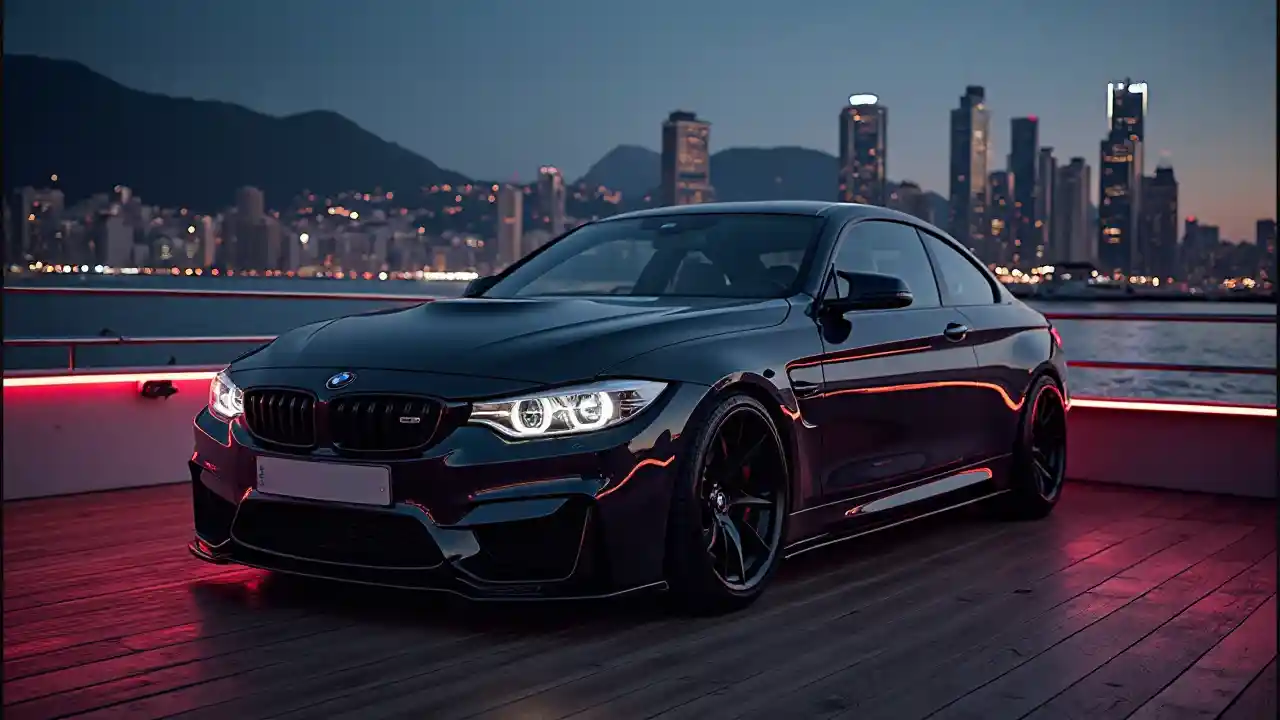 LilyBalapan BMW m4 hitam di malam hari di atas kapal pesiar dengan gedung pencakar langit dan lampu LED merah