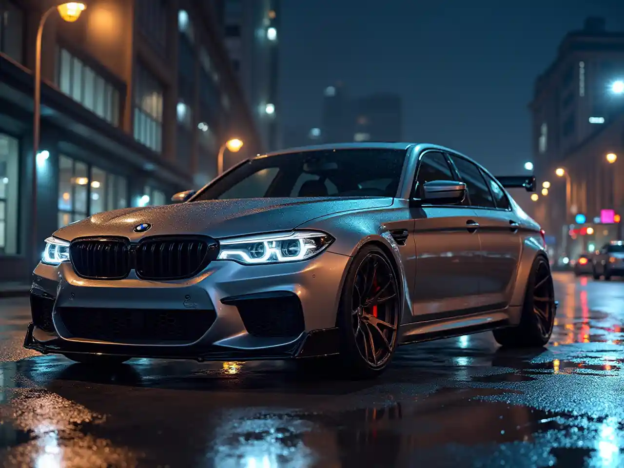 Menghasilkan gambar beresolusi tinggi dari BMW M5 CS F90 yang sepenuhnya disetel, dilengkapi dengan body kit yang agresif. Mobil ini harus ditembak pada sudut rendah, menekankan sikap otot dan fitur aerodinamis. Adegan harus menunjukkan M5 diparkir di lingkungan perkotaan pada malam hari, dengan lampu kota memantulkan cat metalik yang halus. Splitter depan mobil, diffuser belakang, flare fender lebar semuanya menonjol, dan kaliper rem merah menyala dan aksen serat karbon menambah kekuatan. Latar belakang harus menjadi pemandangan kota modern yang remang-remang dengan refleksi di trotoar basah untuk menciptakan suasana yang dramatis dan kuat.