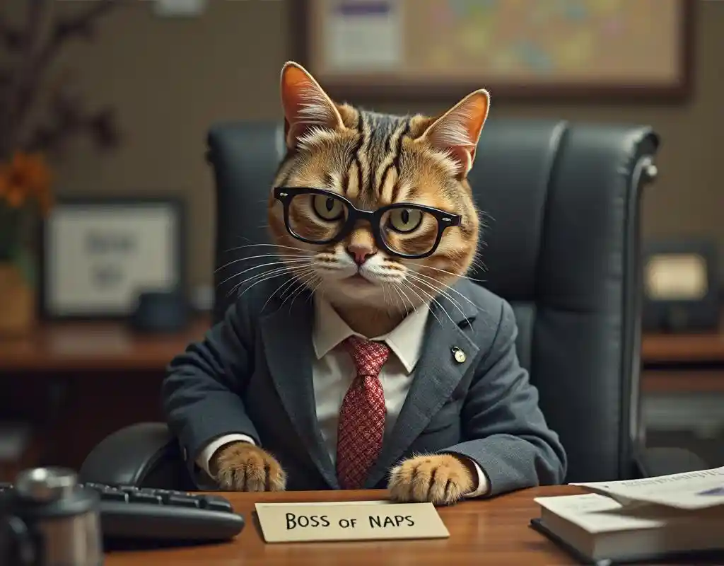 "Seekor kucing kantor yang tampak pemarah, berkacamata kecil dan mengenakan blazer, duduk di meja kerja dengan papan nama'Boss of the Nap '. Satu cakar bersandar malas pada keyboard