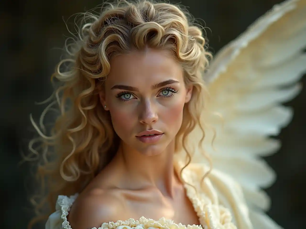 Seorang wanita cantik berambut pirang bermata biru, berambut keriting dan diikat, berwajah malaikat, berpakaian seperti permaisuri Brasil