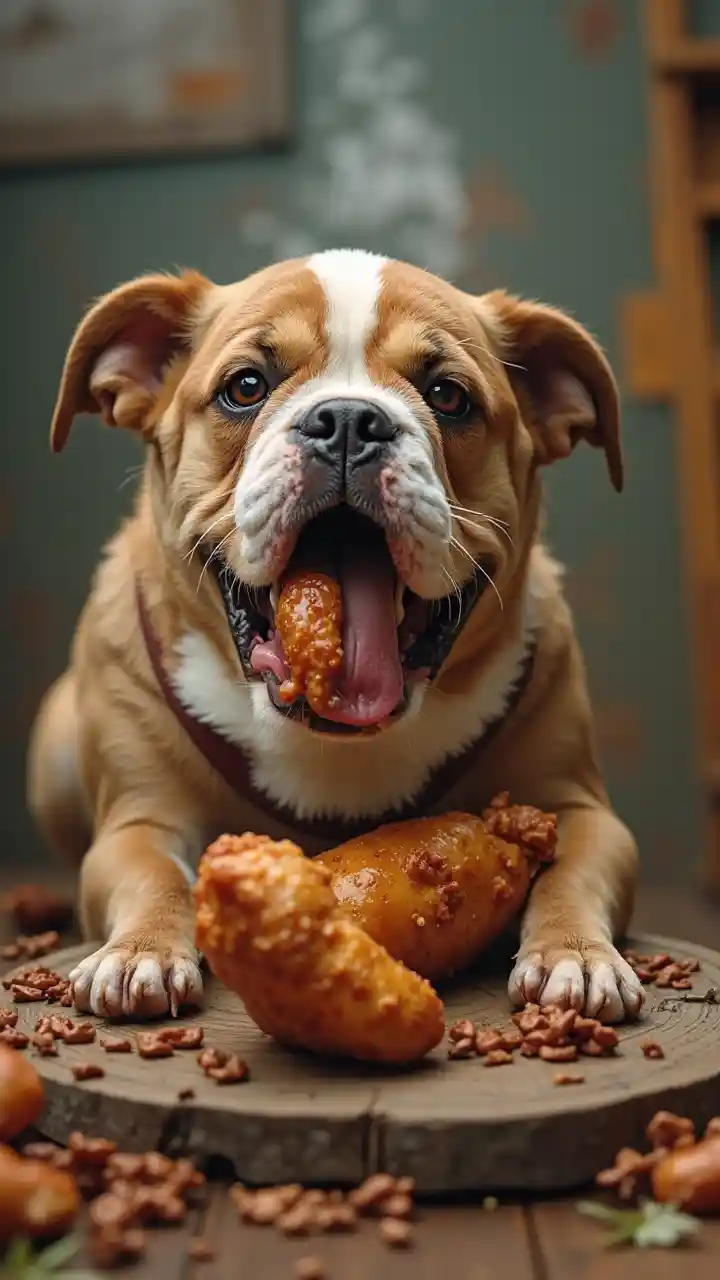 Anjing Bulldog Lucu Untuk Menikmati Makanan Ayam Yang Lezat