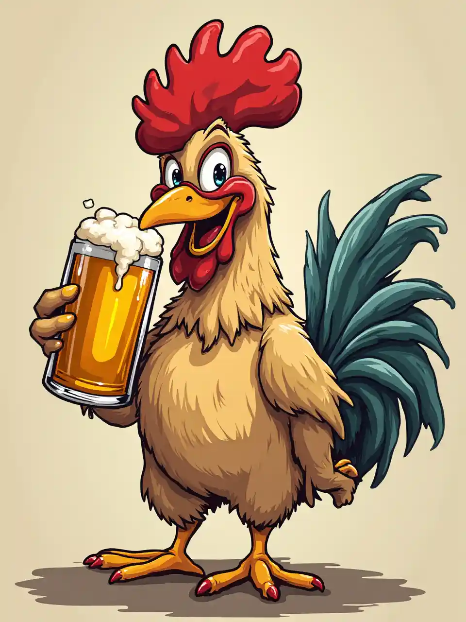 Cartoon rooster chugging a beer