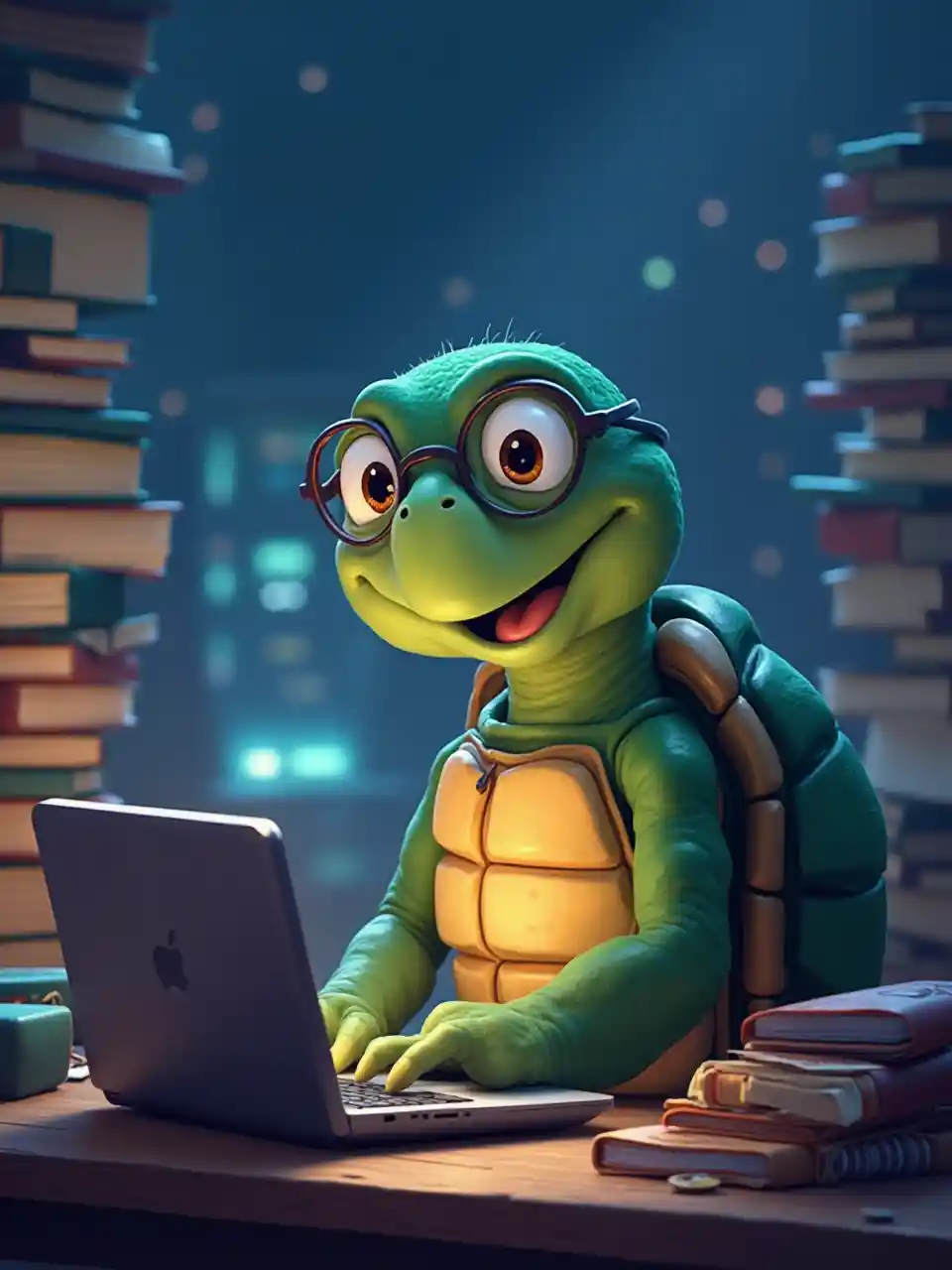 Kartun animasi kura-kura, terlihat pintar, terlihat senang, memakai kacamata, melihat laptop, mencari teknologi, membawa smartphone, setumpuk buku, latar masa depan, film
