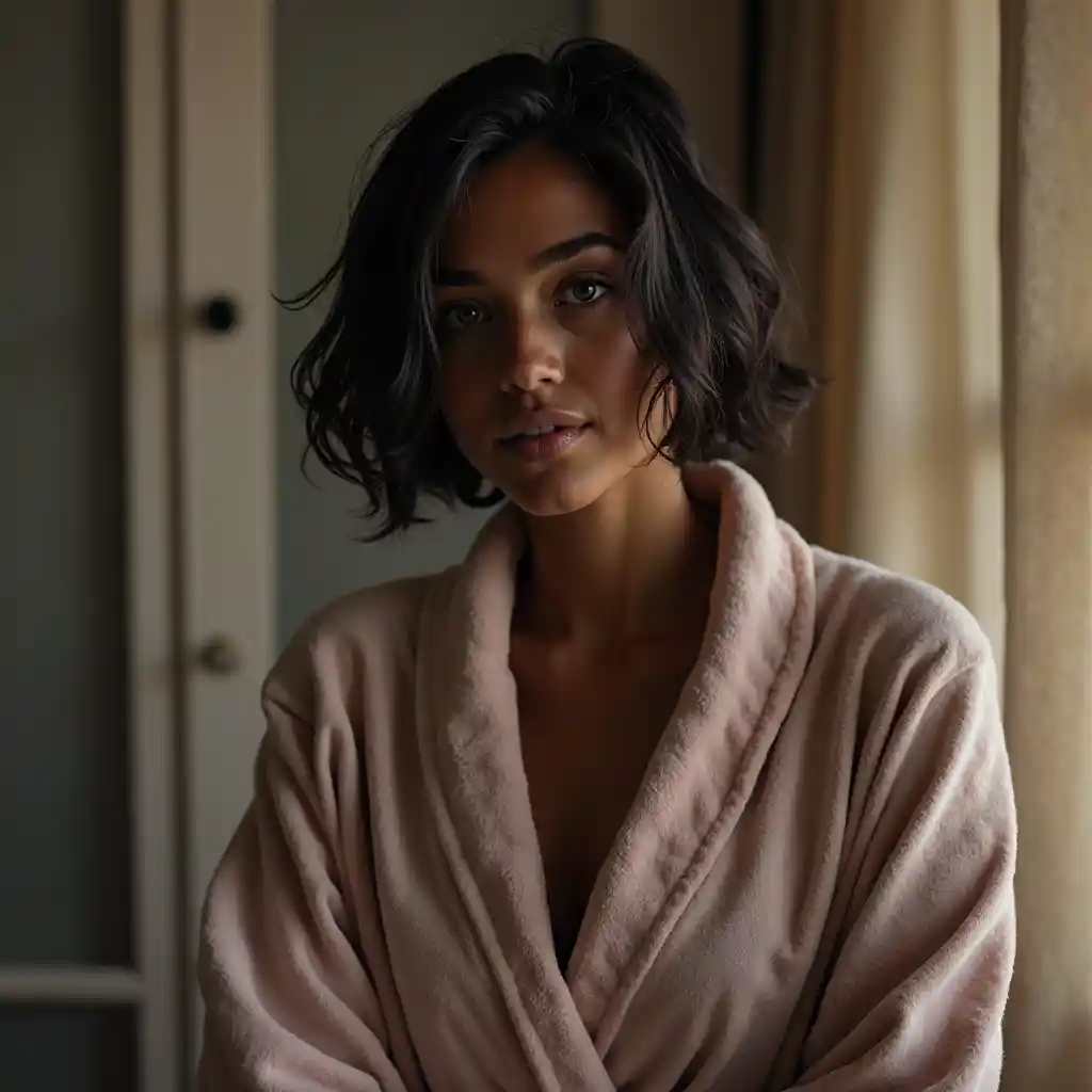Seorang gadis berusia 21 tahun yang kekanak-kanakan memiliki warna kulit gelap yang mencolok. Gadis-gadis modern memiliki rambut panjang ultra-pendek platinum tengah malam di jubah mandi mereka di ruang tamu. Warna rambut ganda campuran