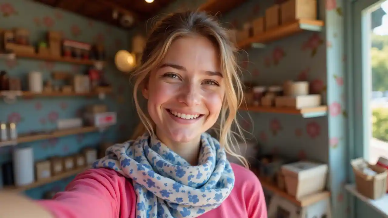 Memancarkan kehangatan dan positif, seorang wanita muda menangkap selfie dengan senyum lebar, mengenakan atasan merah muda yang energik yang melengkapi pembawaannya yang ceria. Dia mengenakan syal bermotif biru-putih di lehernya untuk menambahkan sentuhan keanggunan pada tampilan kasualnya. Di belakangnya, bagian rak toko yang sibuk terlihat, penuh dengan berbagai barang dagangan, menyiratkan lingkungan sehari-hari yang ramai. Latar belakang bermotif bunga menciptakan suasana seperti di rumah, dengan cahaya alami yang lembut menyoroti fitur wajahnya, menyiratkan saat-saat menyenangkan dalam kehidupan sehari-hari yang ramai. Emosi keseluruhan menggoda dan bersemangat tinggi, yang menunjukkan kepribadian subjek dan vitalitas di sekitarnya.