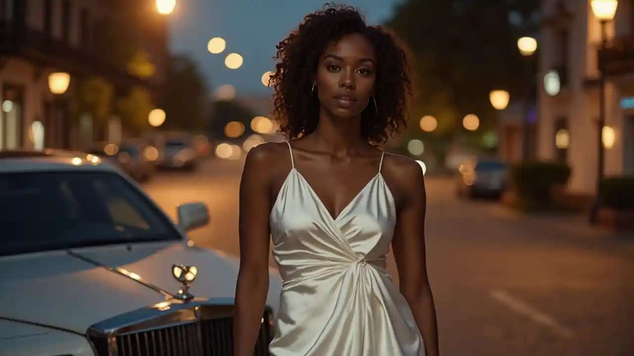 Bayangkan seorang wanita berkulit coklat gelap mengenakan gaun sutra putih yang chic, berdiri di bawah cahaya lampu jalan yang lembut. Gaun itu tersampir dengan anggun di lekuk tubuhnya, dan dia berdiri dengan percaya diri di depan sebuah mobil mewah.