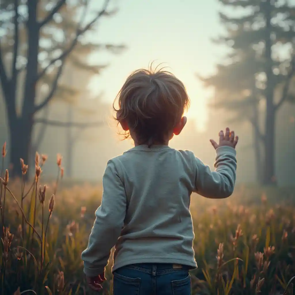 AdelinePunggung anak yang mengulurkan tangannya ke alam dengan skema warna futuristik, gambar fotografi 4k