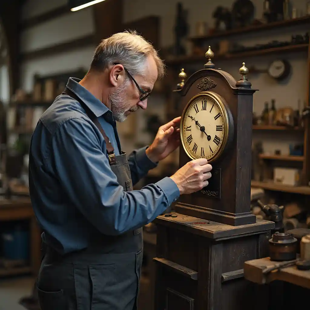 WyattSeorang pria di bengkel sedang memperbaiki jam analog.