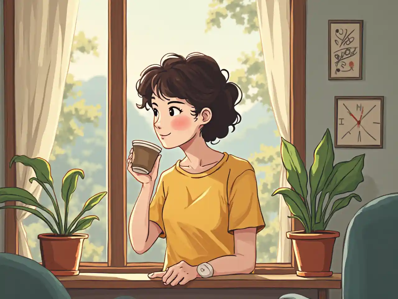 SamuelGadis mengambil cangkir kopi di belakang jendela ilustrasi pola vektor
