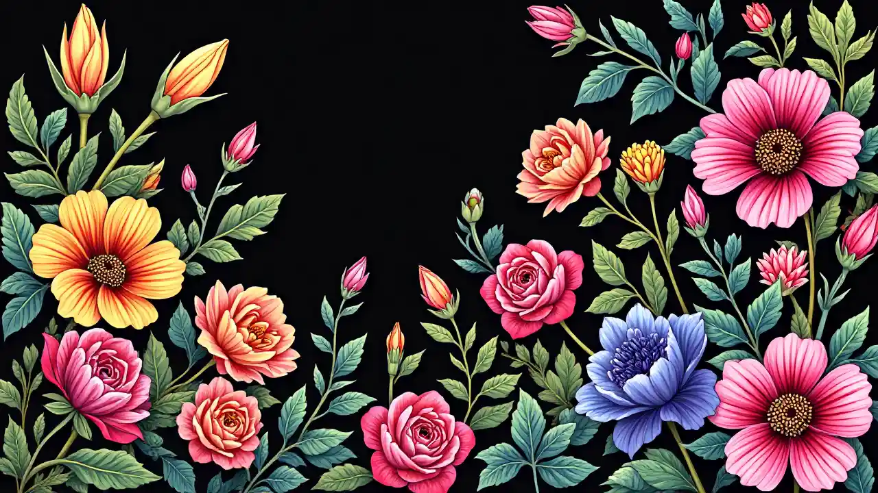 Buat halaman sampul ukuran A4 yang hidup dan penuh warna untuk buku mewarnai pada bunga. Latar belakang hitam Banyak bunga berwarna-warni membuat sampul tampak cerah dan hidup di mana bunga tumpang tindih satu sama lain, termasuk bunga mawar lily dan bunga lainnya di halaman sampul membuat warna cerah dalam dua nada dan membuat warna pop