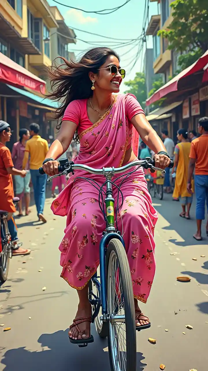 Di jalan-jalan kota India, seorang wanita India mengendarai sepeda berwarna-warni, rambutnya tergerai tertiup angin, mengenakan sari bunga merah muda, dikelilingi oleh toko-toko dan kafe yang ramai, pejalan kaki berjalan, menangkap ekspresi ceria dan semangat riang para wanita, dalam gaya pop art modern, banyak cetakan berulang, warnanya sangat cerah,
