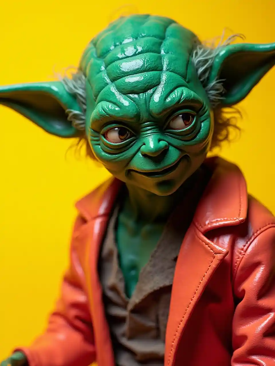 Gambar Yoda dalam cat mayat logam hitam terbuat dari bahan plastik berwarna cerah seperti mainan, latar belakang kuning cerah, cahaya terang, warna jenuh terang, menyenangkan, detail tinggi, majalah fashion, fokus tajam, makeup ekspresif terang Depth of field, detail tinggi yang luar biasa