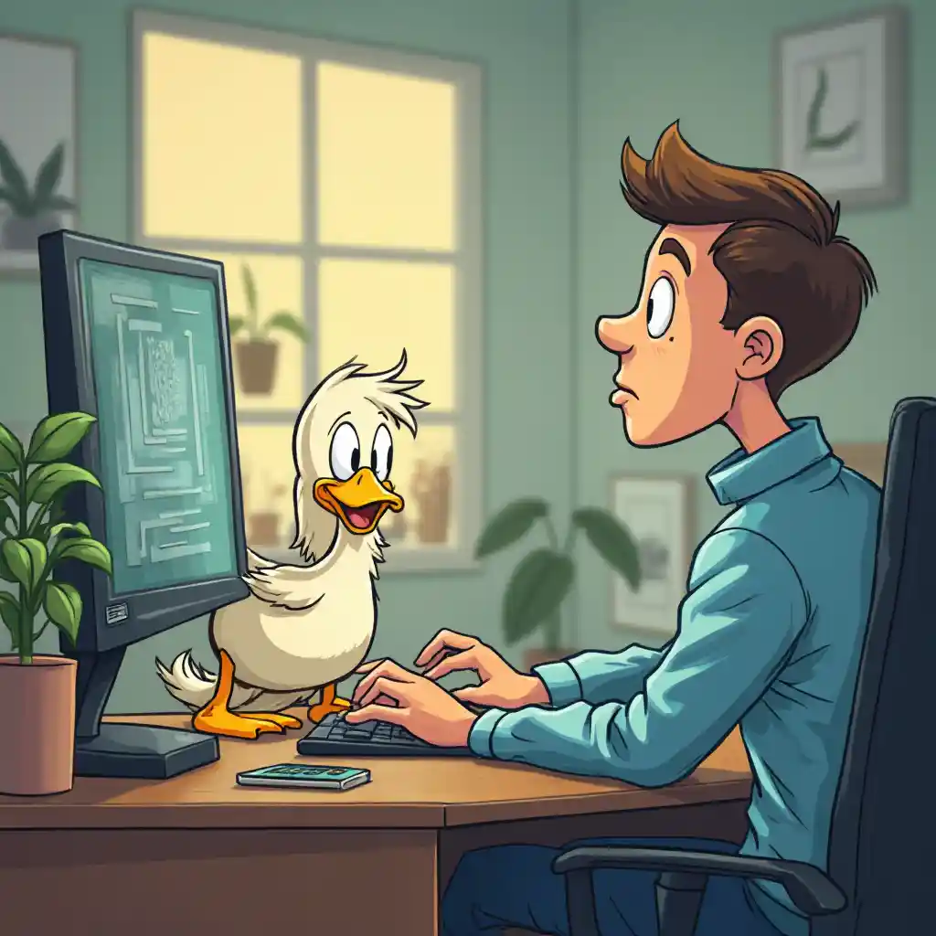 Ketika seorang pria bekerja dengan komputer di kantor, kartun bebek tampak bingung melihat layar