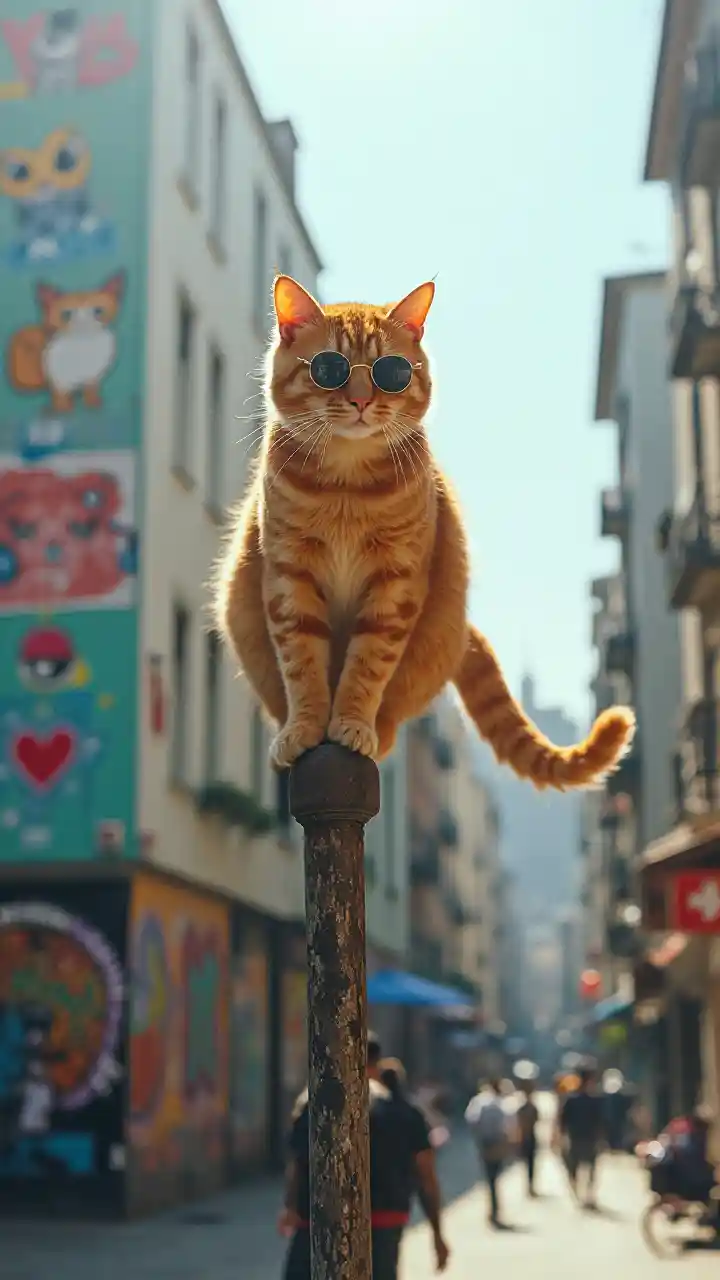 "Seekor kucing oranye super keren berdiri dengan keseimbangan sempurna di atas tiang listrik tipis, seperti orang yang berjalan di atas tali sirkus, dengan sinar matahari yang cerah di siang hari memberikan bayangan yang tajam. Mengenakan kacamata hitam bulat kecil dengan ekor melengkung anggun untuk keseimbangan, kucing itu menatap pejalan kaki di bawahnya dengan ekspresi bangga. Seni jalanan meliputi bangunan di latar belakang, mural grafiti berwarna-warni dengan efek cat percikan. Suar matahari menciptakan artefak lensa, dan kedalaman bidang dangkal mengaburkan jalan-jalan kota yang sibuk di bawahnya. Diambil pada film Kodak Portra 400, dengan saturasi yang dinamis, lensa 85mm mengisolasi kucing di cakrawala pada f/1.8. Bulu kucing menunjukkan tekstur yang teliti, dan setiap kumis menangkap sinar matahari. " **Penguat kualitas: ** "Resolusi 8k, bulu super detail, pencahayaan bioskop, latar belakang bokeh, pemenang penghargaan fotografi jalanan"