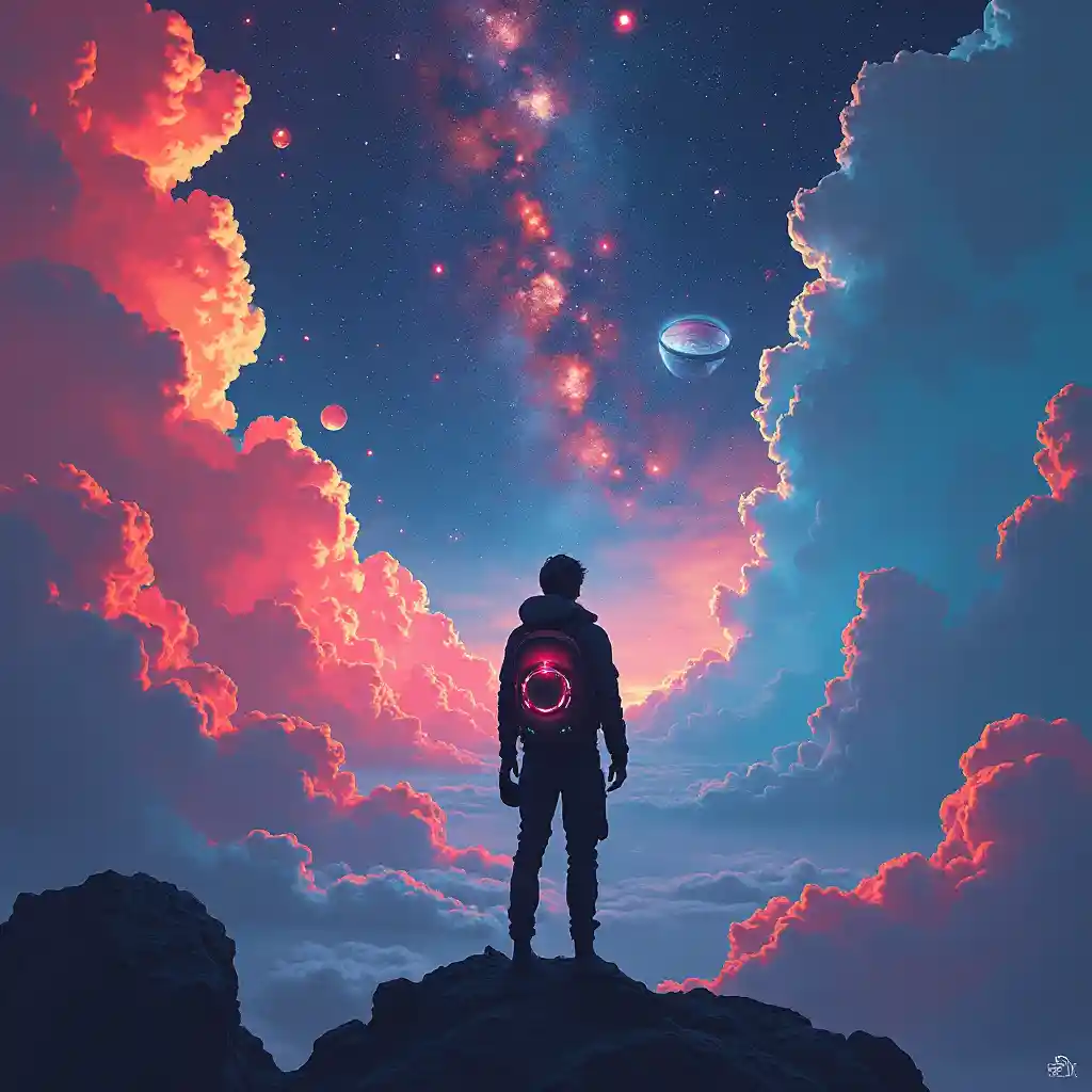 Sosok siluet berdiri di atas singkapan batu, menatap pemandangan kosmik yang semarak yang dipenuhi awan pusaran dengan nuansa merah, merah muda, dan biru. Di atas, bintang-bintang dan benda-benda langit yang tak terhitung jumlahnya berkedip di bawah latar belakang menara dan pesawat ruang angkasa yang jauh, menciptakan perasaan yang fantastis dan penuh petualangan. Sosok itu membawa ransel bercahaya dengan logo bulat yang menambahkan elemen misterius ke komposisi.
