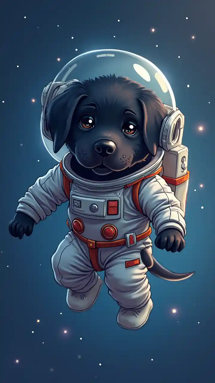 Anak anjing Labrador hitam yang lucu berpakaian sebagai astronot mengambang di luar angkasa, berbentuk alam semesta dan anime