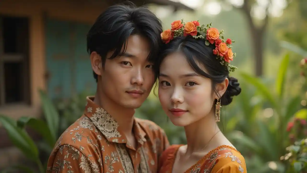 Foto couple muda dengan busana cottage core, epik detail, realistis, ray tracing, realistis, sinematik, ultra HD, retro, foto tubuh manusia realistis, ultra realistis, epik detail, detail rumit, fotografi profesional.