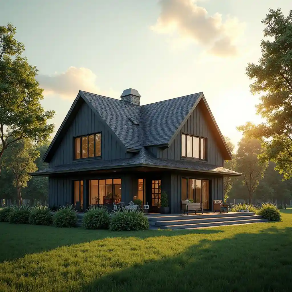 Membuat desain cottage pedesaan modern dengan cara yang cepat: "Seni konsep sinematik dari cottage pedesaan dua lantai modern yang sangat rinci yang dibangun dari bahan bangunan modern yang mahal, sinar matahari dari zenith menerangi rumah, rumah terletak di halaman hijau dengan pagar logam rendah di sekitarnya, taman bermain di halaman dan semak-semak dekoratif rendah yang tumbuh, desain keseluruhan yang chic dan halus, disajikan dalam gaya lukisan hiper-realistis, sangat rinci, sinematik