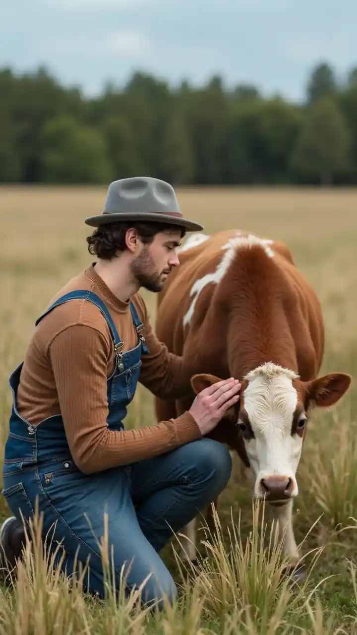 Gambar menunjukkan seorang pemuda berlutut di tanah sambil memegang seekor sapi. Pria itu mengenakan sweater cokelat, overall biru, dan topi abu-abu. Dia berlutut di atas rumput dan membelai hidung sapi. Sapi ini berwarna coklat dan putih, hidung dan telinganya berwarna hitam. Latar belakangnya adalah lapangan rumput yang tinggi. Langit biru, dan suasana keseluruhan gambar tenang dan damai.