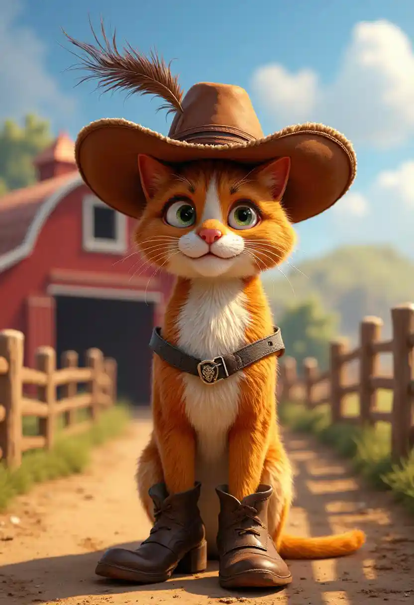 Gaya kartun丨DreamWorks Pictures丨Kucing memakai topi seperti koboi berbulu, sabuk hitam, sepatu bot kulit besar, gudang pertanian besar yang indah, pagar
