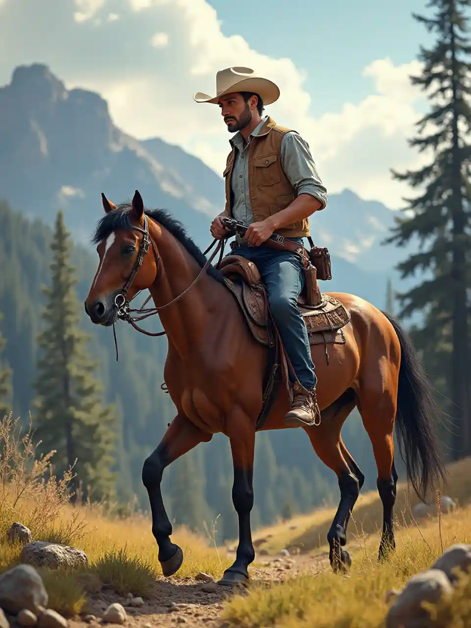 Koboi di punggung kuda Di hutan pegunungan, kuda itu berotot dan berwarna coklat dengan surai dan kuku hitam. Ada laso dan senapan di atas pelana. Pria itu memegang revolver Colt, topi cerah yang bermandikan sinar matahari