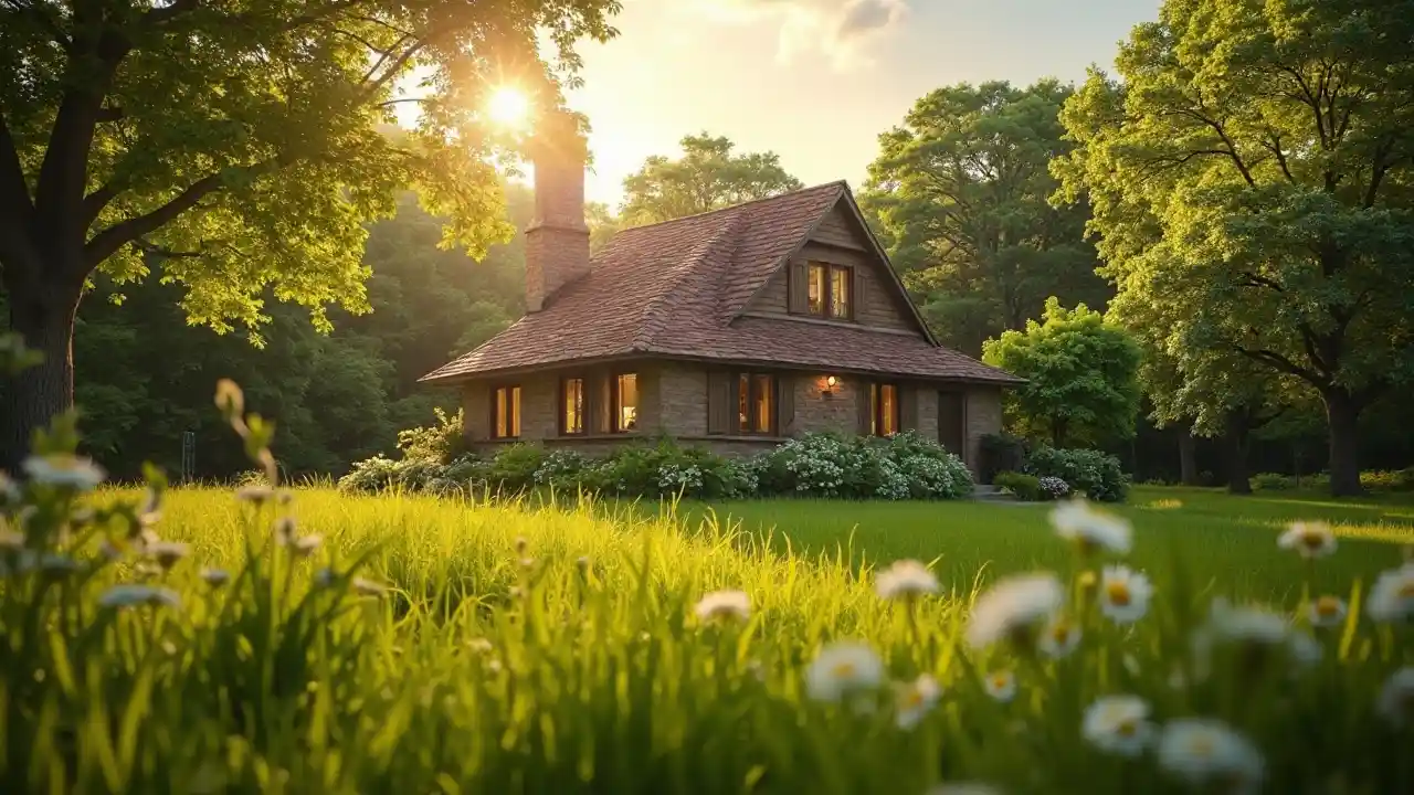 Cottage Inggris di padang rumput hijau yang nyaman di bawah sinar matahari yang hangat