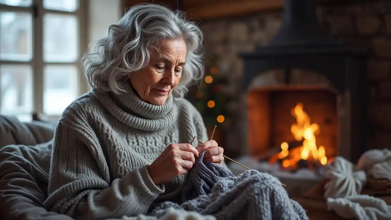 Merajut selimut di kabin bersalju, seorang wanita Eropa berusia 76 tahun dengan rambut ikal perak mengenakan sweater dengan sulaman salju. Api berderak dan jendela buram membingkainya, dan jarum mantapnya memancarkan pesona kehangatan dan kenyamanan di lingkungan musim dingin yang tenang. Tangannya merajut pelipur lara.