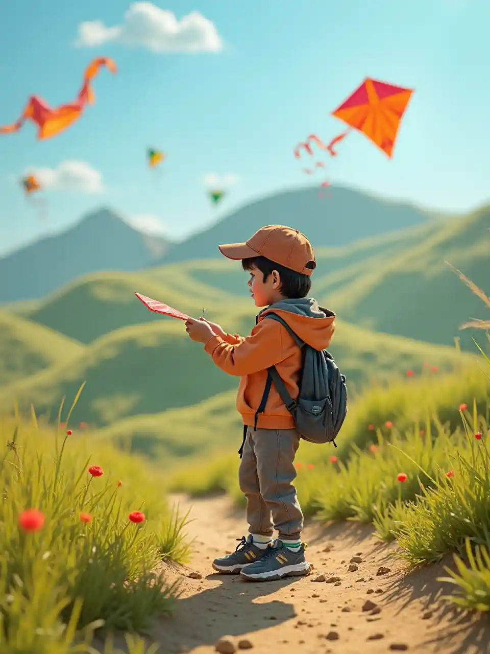 Seorang anak laki-laki Timur Tengah berusia 10 tahun yang mengenakan topi mendesain layang-layang di sebuah taman berangin, mengenakan hoodie dan sepatu kets. Layang-layang berkibar dan perbukitan hijau membingkainya, dan potongan yang tepat memancarkan kreativitas dan petualangan di lingkungan luar yang semarak.