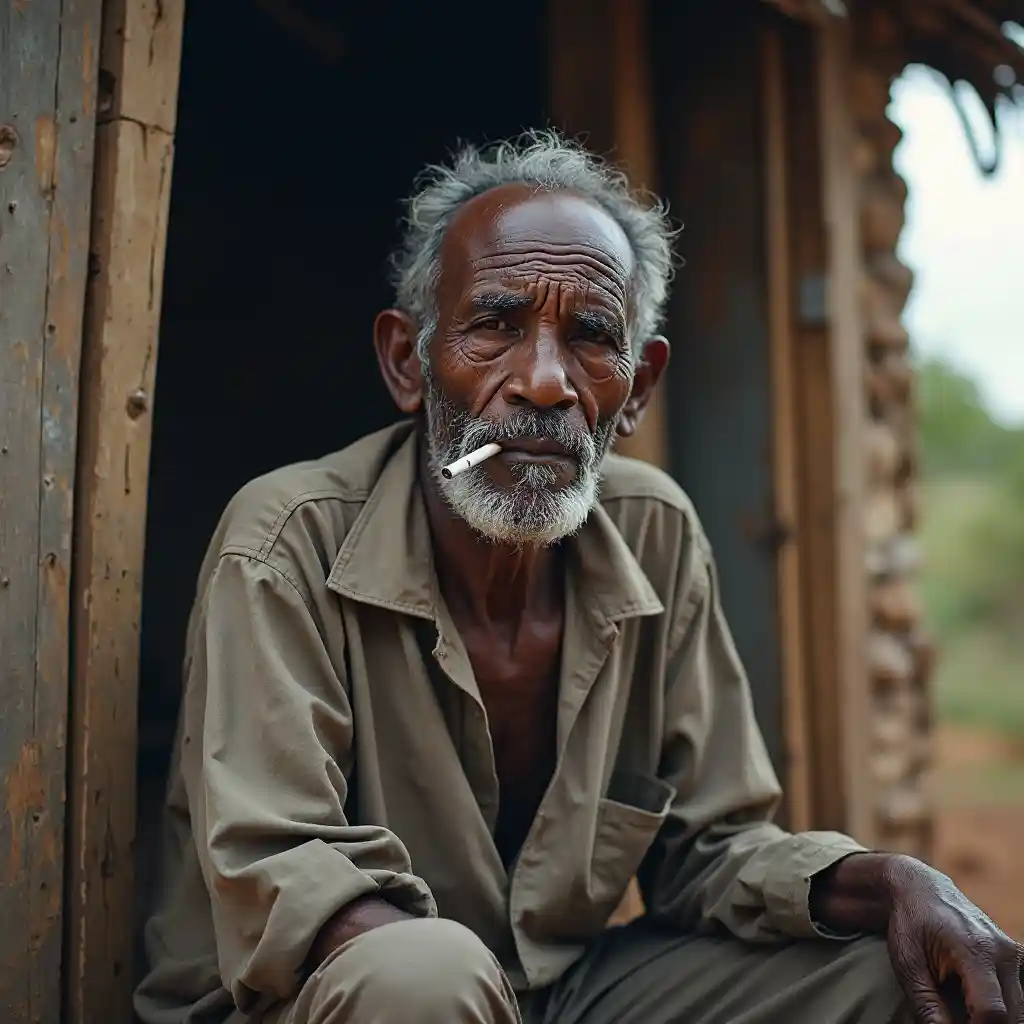 ScarlettSeorang pria tua Afrika dengan rokok di mulutnya, duduk di luar gubuk dan menangis